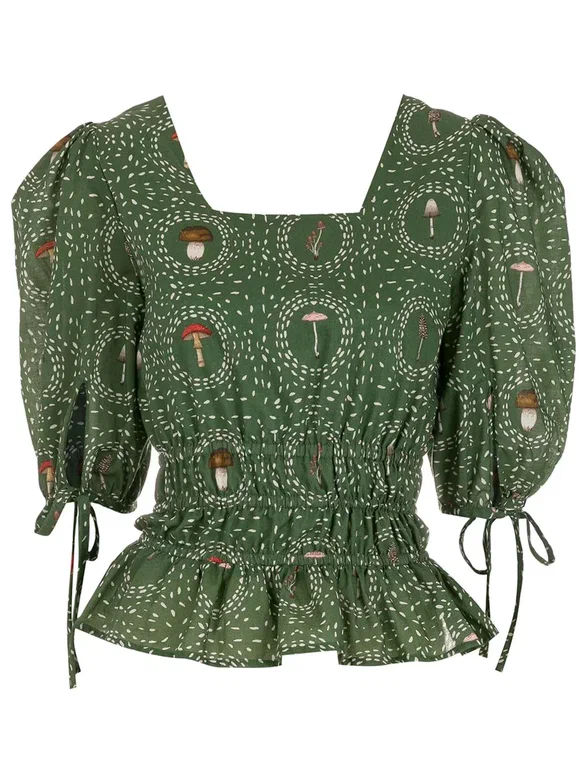 Вслед за Стеллой Маккартни грибные принты в весенней коллекции показал бренд Rodarte, подарив нам свободные шелковые платья с грибами с модным сочетанием лаванды и оттенков зеленого.