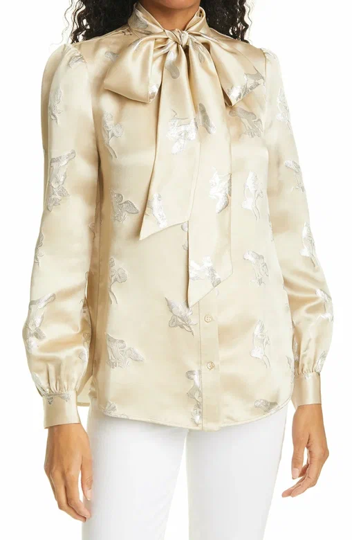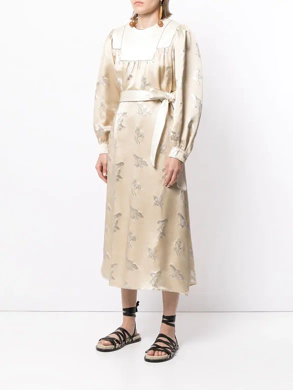 Вы романтик и вам ближе викторианско-эдвардианская эпоха и деликатные акценты? Тогда обратите внимание на шелковые платья и блузы в цвете экрю с едва заметным жаккардовым рисунком грибов от Тори Бёрч. Правда, данное платье уже везде распродано, ищите на вторичном рынке.