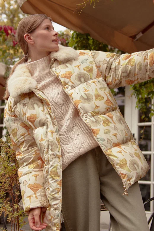 Бренд Alena Akhmadullina в коллекции осень-зима 2022 выпустил линейку Dreams — роскошные легкие пуховики с грибным принтом, и они до сих пор в продаже и сейчас даже на сейле 30%. Горячо рекомендую, особенно блондинкам и рыжим. Хотя и я не удержалась.