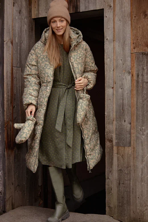 В пуховике макси Ахмадуллина сочетала грибной принт с цветом, который в англоговорящем мире называется «mushroom green», то есть грибной зеленый, цвет сыроежки пищевой, серо, чуть желтовато-зеленый.