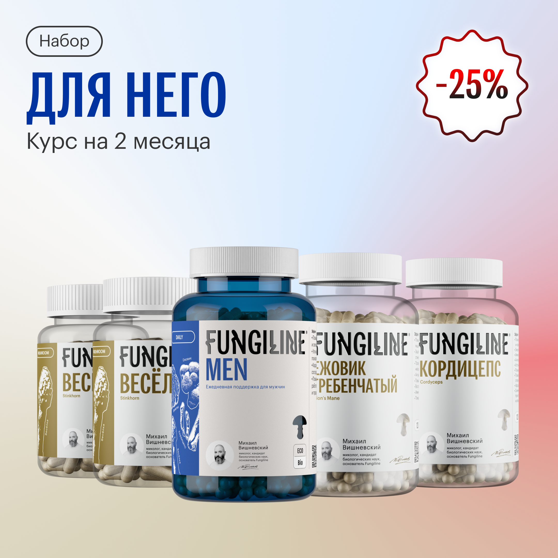 Набор ДЛЯ НЕГО включает в себя продукты из линейки грибной аптеки: Daily Men + Ежовик Гребенчатый + Кордицепс + Веселка
