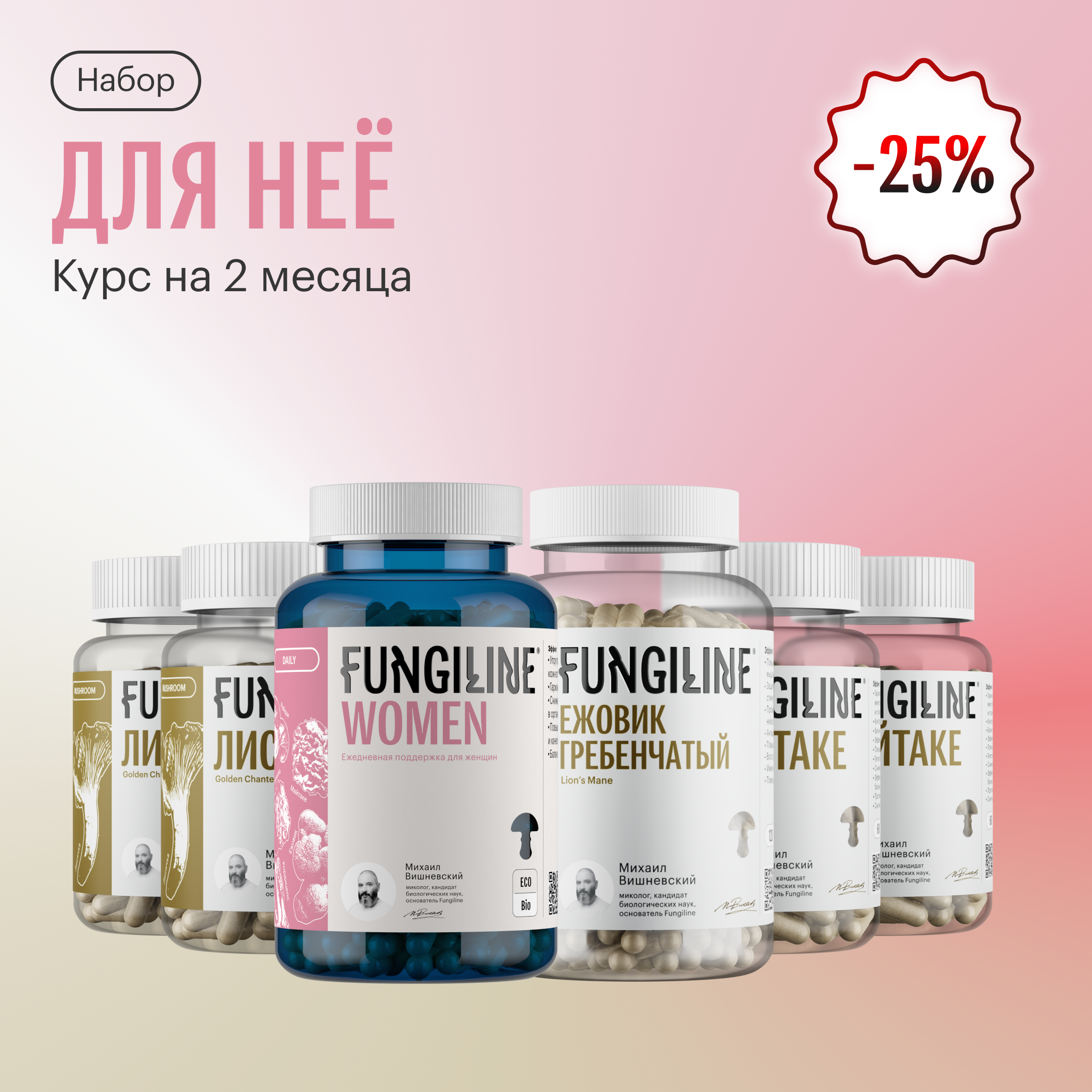 Набор ДЛЯ НЕЁ включает в себя продукты из линейки грибной аптеки: Daily Women + Ежовик Гребенчатый + Майтаке + Лисичка