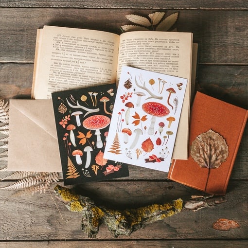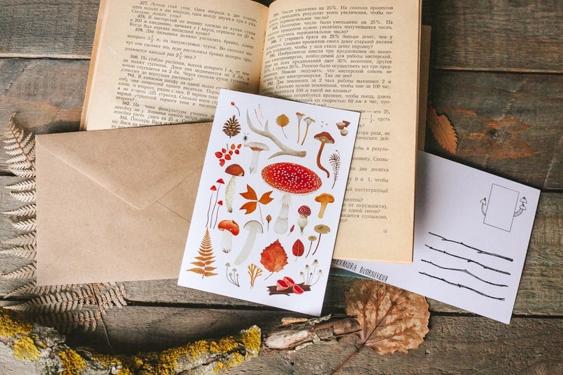 Почтовая открытка для оригинальных поздравлений «Лесные находки» светлая от российской художницы Александры Дворниковой.