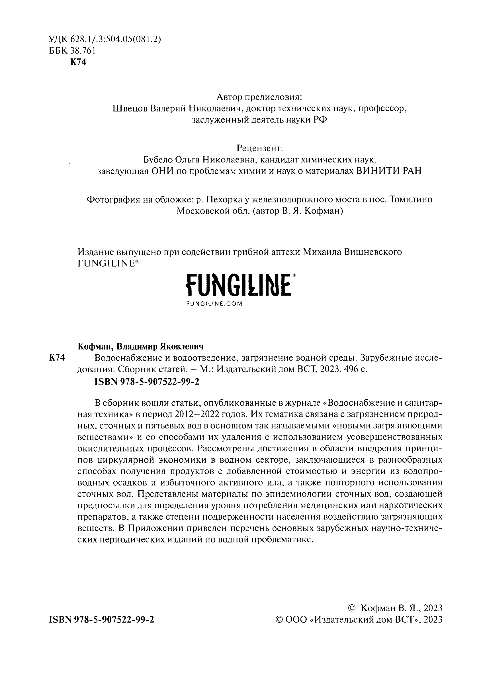 В сборник вошли статьи, опубликованные в журнале «Водоснабжение и санитарная техника» в период 2012—2022 годов. Их тематика связана с загрязнением природных, сточных и питьевых вод в основном так называемыми «новыми загрязняющими веществами» и со способами их удаления с использованием усовершенствованных окислительных процессов. Рассмотрены достижения в области внедрения принципов циркулярной экономики в водном секторе, заключающиеся в разнообразных способах получения продуктов с добавленной стоимостью и энергии из водопроводных осадков и избыточного активного ила, а также повторного использования сточных вод.